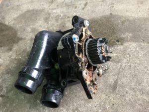 ウォーターポンプから冷却水が漏れて、オイルと混ざってグチャグチャ…
