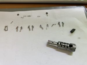 イグニッションキーシリンダーをコラムから取り外して分解。